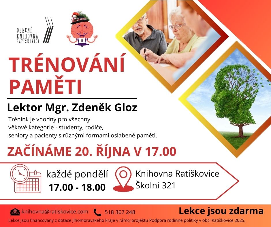 Trénování paměti v knihovně probíhá pod vedením certifikovaného lektora Mgr. Zdeňka Gloze. (www.pametar.cz/ a www.facebook.com/pametar).
